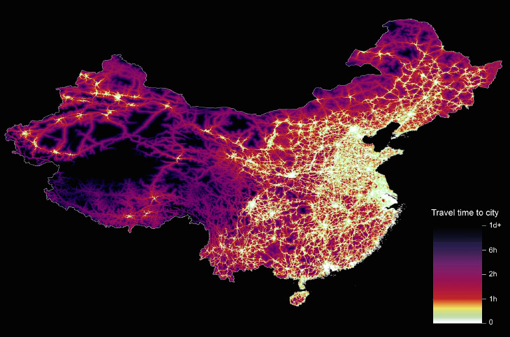 Международная команда специалистов при Оксфордском университете составила уникальную карту мира. Она отображает, сколько времени люди из разных уголков планеты должны потратить, чтобы добраться до более-менее крупного города или районного центра. Визуализация создана на основе картографических проектов Open Street Map и Google, показывает большие различия между странами в смысле транспортной доступности городских центров.