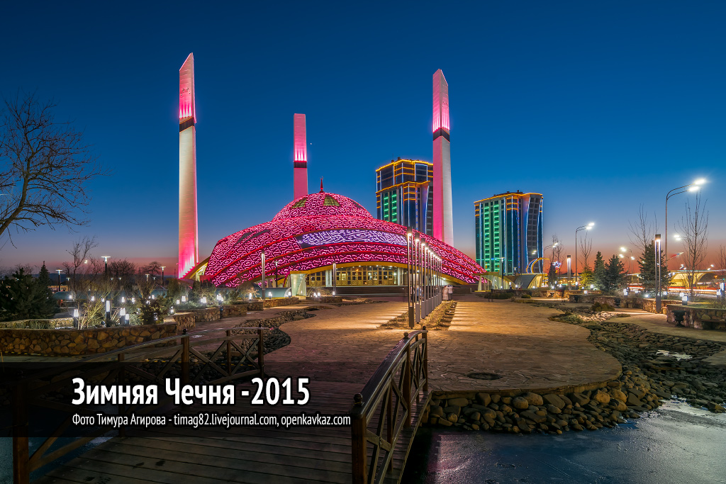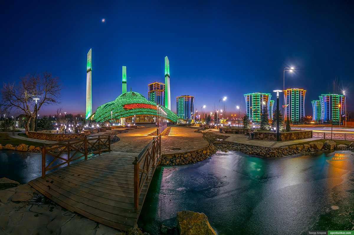 На первой фотографии – Мечеть имени Аймани Кадыровой в городе Аргун. Невероятно красивая вечерняя подсветка, которая меняется каждую минуту.