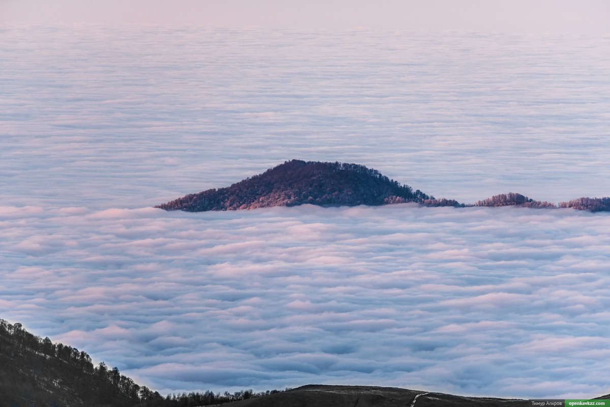 На обратном пути видели вершины гор в тумане. Это гора Эртин-Корт, Веденский район ЧР. На ней расположено село Хьаьжи Эвла (бывшее Первомайское).