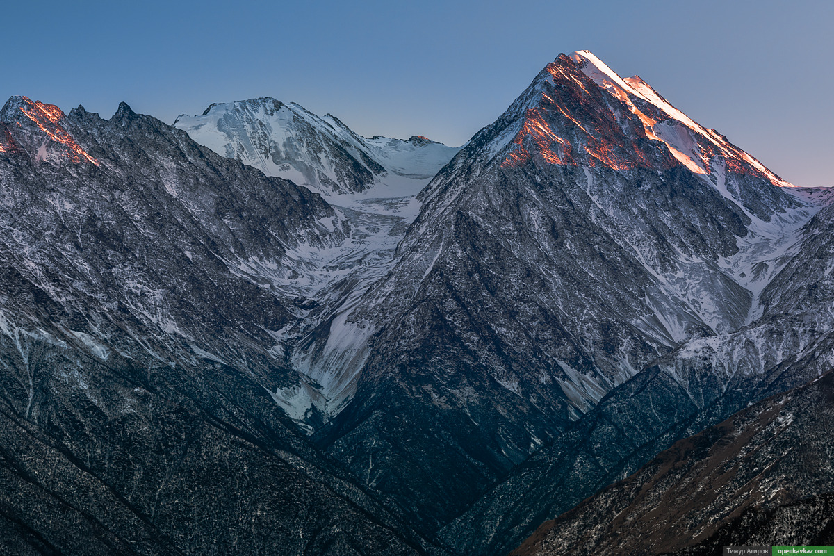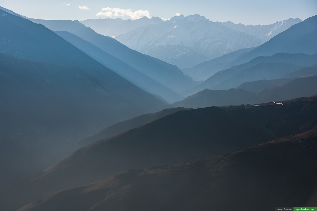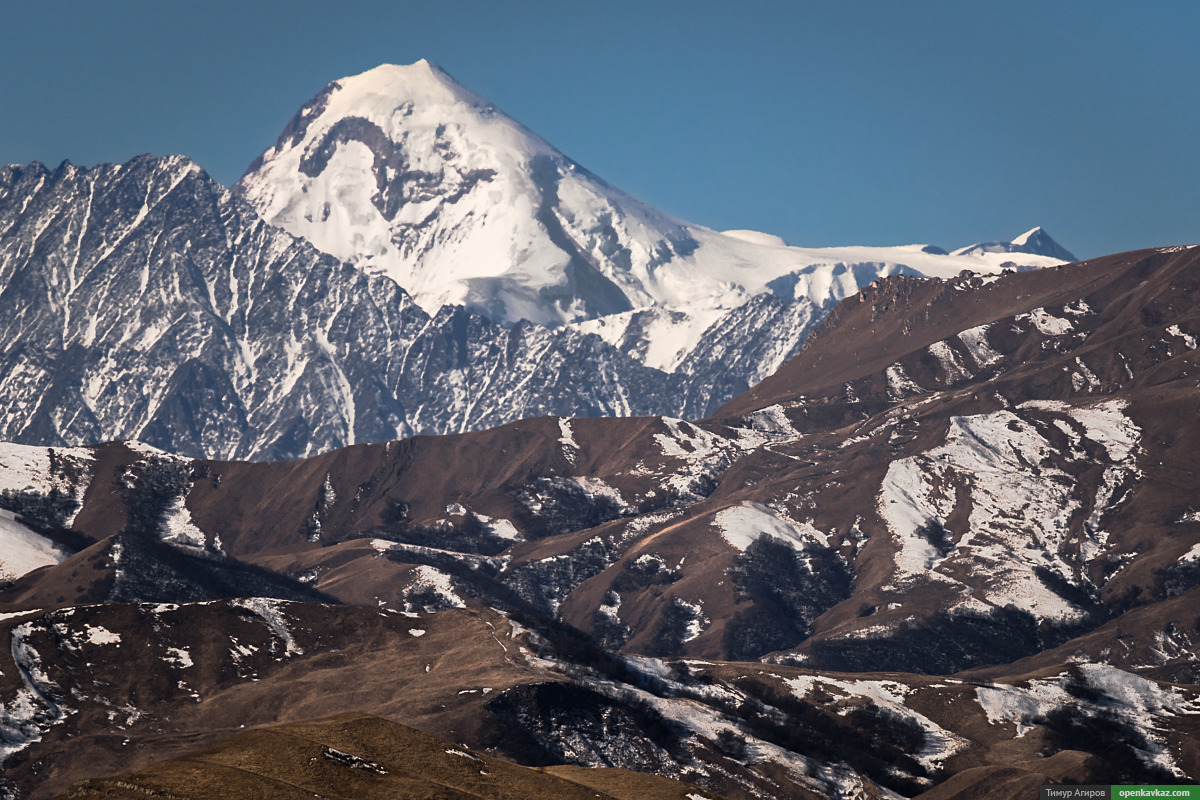 В 80 км виден Казбек, а рядом, левее гора Эрзи, которая расположена в Ингушетии за 50 км от точки съемки в Галанчожском районе.