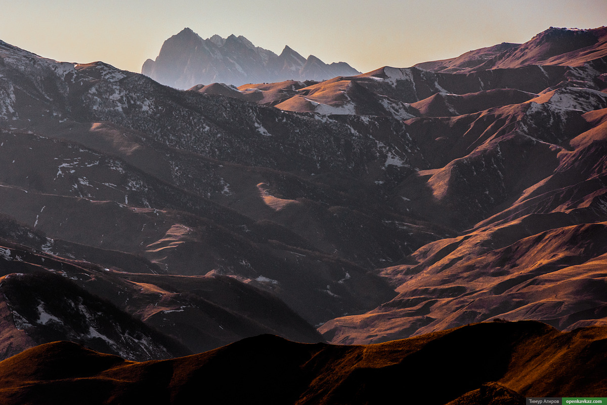 Сейчас делается дорога в соседнее ущелье, откуда можно увидеть потрясающие виды, вплоть до Ингушетии. Это гора Хахалги, которая на границе республик, я ее часто фотографировал из Ингушетии, и тут первый раз её увидел из Чечни!
